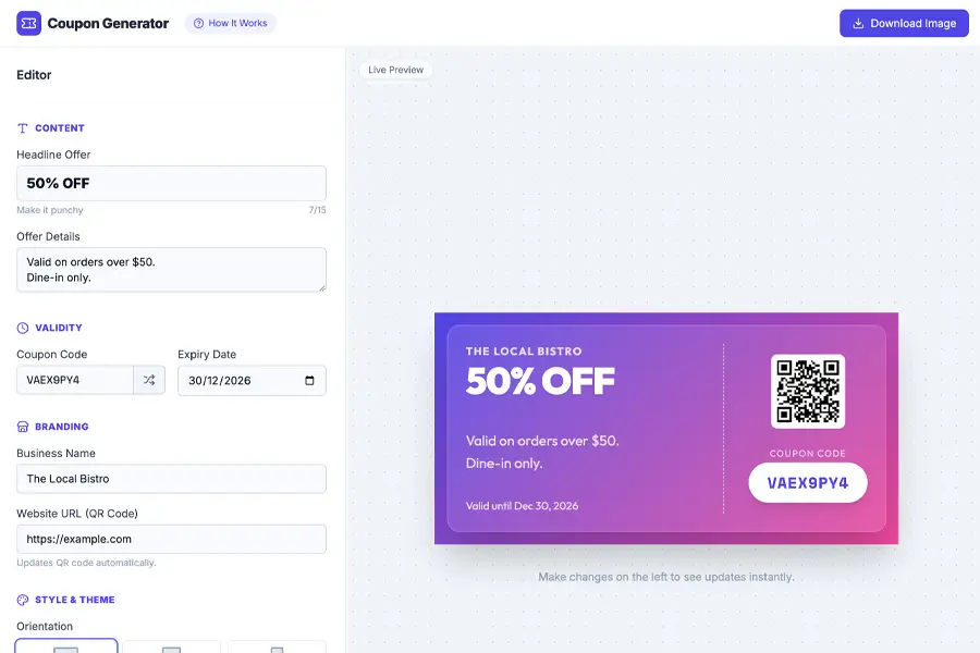 Generate clean, professional coupon images that look great on social media, websites, and print. Choose layouts, colors, and styles that fit your brand in seconds.